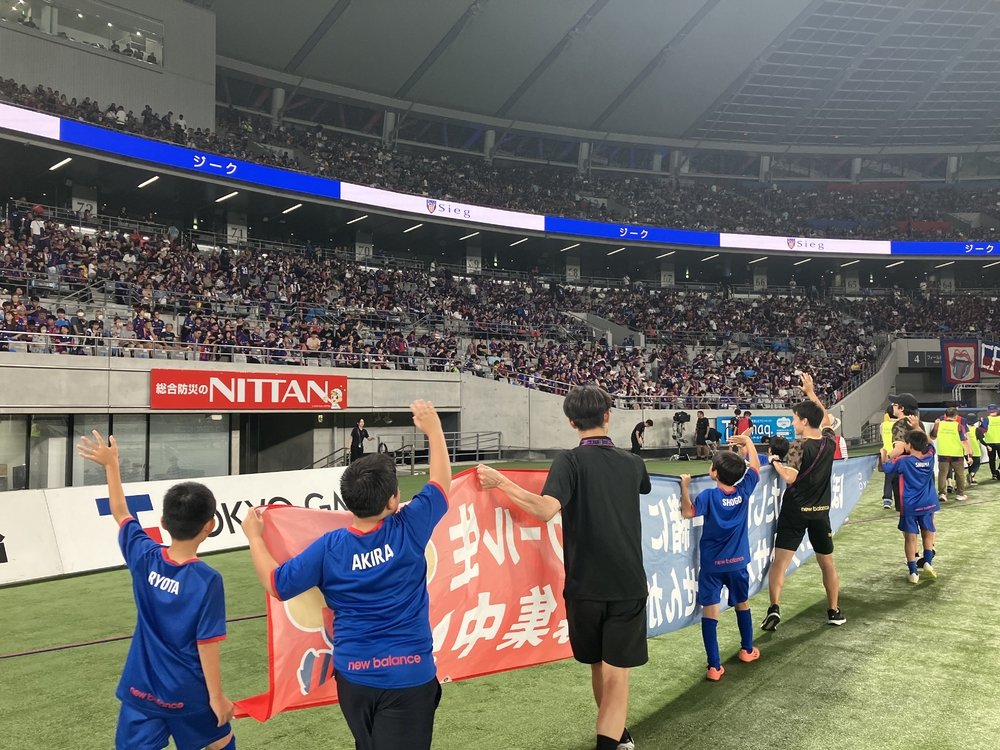 Desta vez, também fizemos uma volta ao redor do campo com o banner de recrutamento de alunos para a escola de futebol e futsal do FC Tokyo!