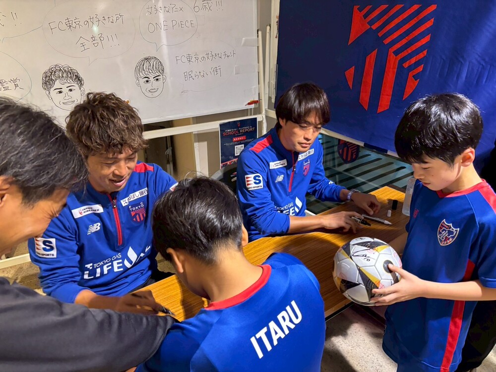 Depois disso, ele assinou cuidadosamente os produtos do FC Tokyo que os alunos trouxerame os papéis coloridos, e os alunos, embora nervosos, expressaram seus sentimentos de gratidão olhando firmemente nos olhos.