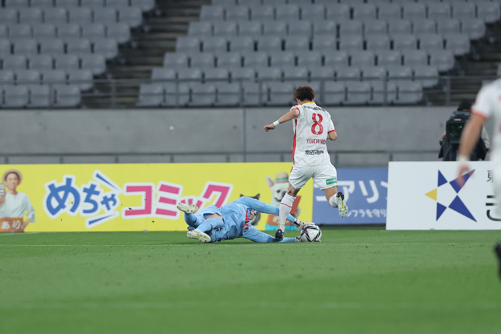 从比赛一开始就控球的东京,以快速的节奏移动球,侵入对方半场。上半场第8分钟,永井谦佑选手在禁区外左侧接球,射向球门右角的弧线球射门,但被LANGERAK选手精彩扑救,未能攻破球网。随后虽然有一段时间被名古屋控球,但夺回球权后,东京通过少触球快速推进,瞄准对方球门。上半场第30分钟,利用定位球机会压进禁区前沿,安部柊斗选手一触射门,球穿过密集防守直飞球门,但再次被LANGERAK选手扑出。上半场第40分钟,抓住名古屋一瞬间的空隙,边后卫前插后,小川谅也选手送出纵向传球。反应迅速的永井选手利用瞬间速度转身甩开防守者,带球深入禁区边线附近,传出回敲传球,但稍稍未能传到冲刺至近门柱的松木玖生选手脚下。