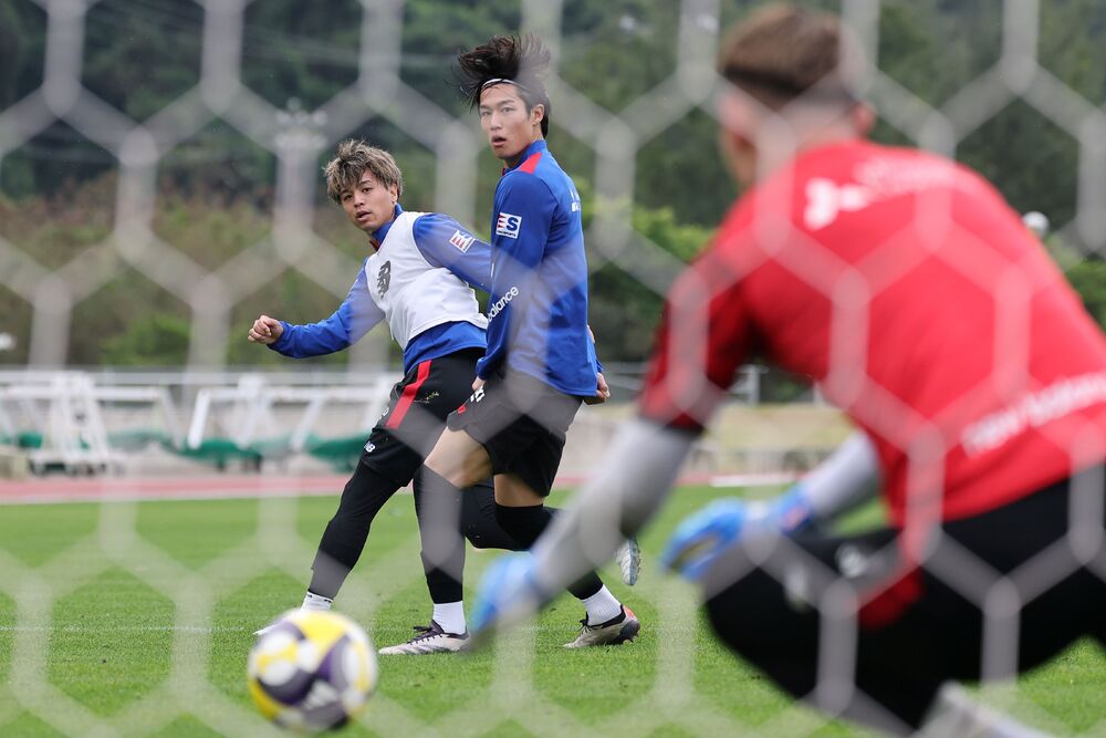 松桥力藏教练的每一项训练都融入了战术精髓,这也是其特点之一。这一天进行的2对2练习中,球门被斜对角放置,目的是提高防守滑动的意识。