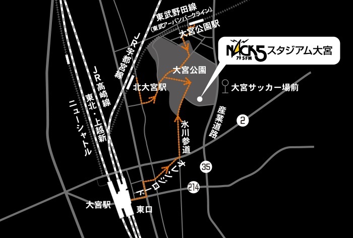 ・从JR“大宫”站东口乘坐国际兴业巴士“导守循环”线路,在“大宫足球场前”下车,步行约1分钟