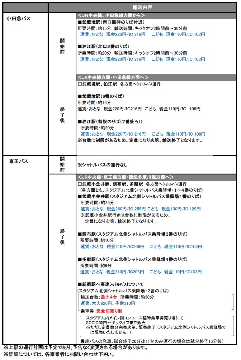 4/14(周日)2019明治安田生命J1联赛第7轮vs鹿岛Antlers(14:00开球/味之素体育馆)的班车和路线巴士运营信息。