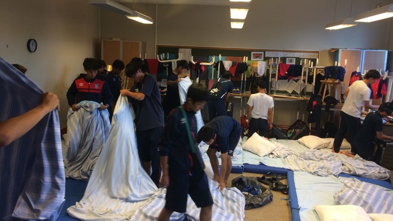 从今天起,大会期间的住宿由大会方面安排,在当地一所学校的教室内铺设床垫,所有选手和工作人员共同生活。