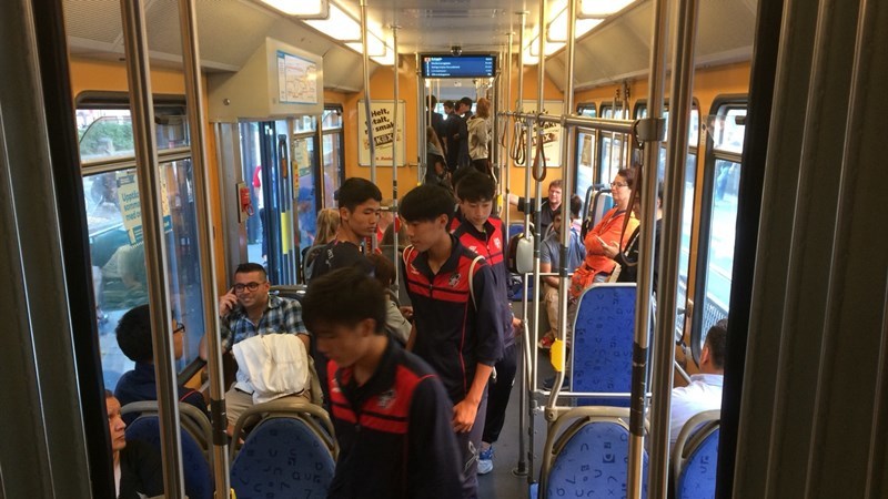 随后,乘坐有轨电车前往比赛场馆附近的餐厅吃晚餐。