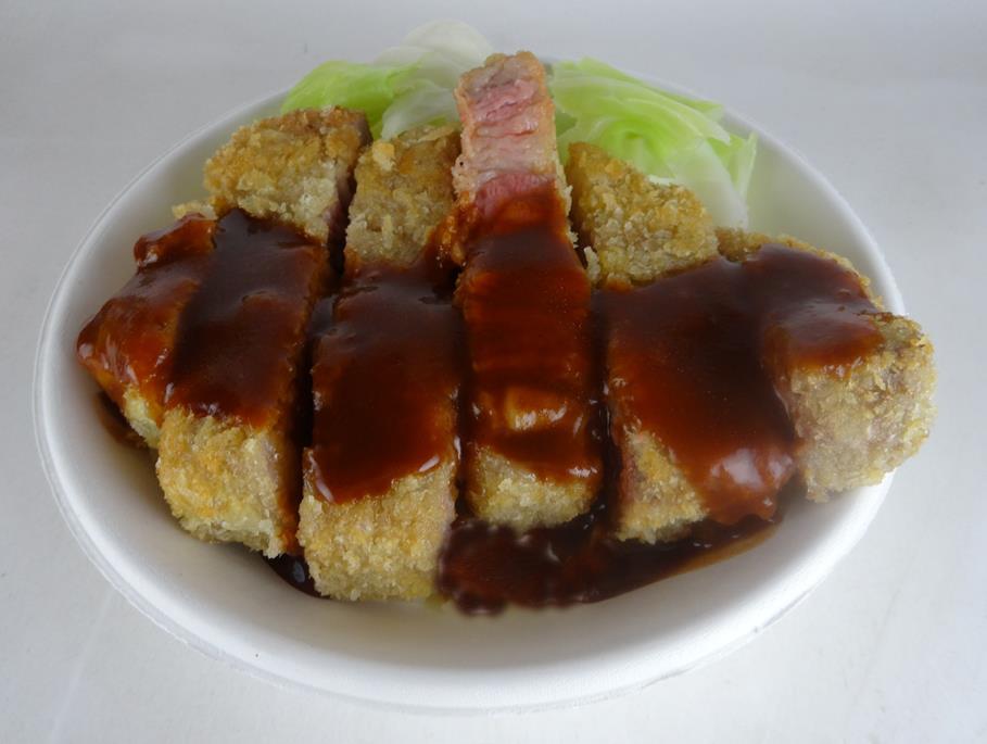 用酥脆的面衣包裹牛肉炸制而成的“可以尽享半熟牛肉美味”的牛排炸猪排。搭配大量蔬菜制成的原创德米酱。