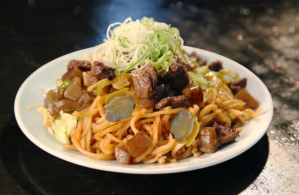 用酱油为基础的甜辣汤汁慢炖牛筋和魔芋,神户・长田发源的地方料理,搭配大颗海鲜呈现。香喷喷的酱炒面裹着炖牛筋,味道绝佳。