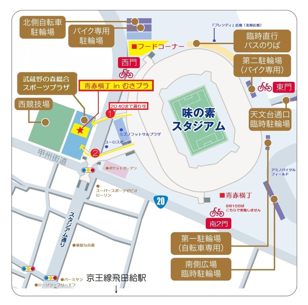 ①…味之素体育馆→前往“青赤横丁 in むさプラ”的通行时间因运营管理限制至20:40,请注意。