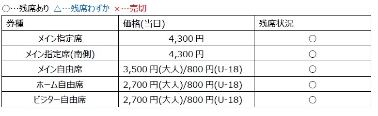 ※由于入场闸口的关系,购买主看台指定席、主看台自由席、客队自由席的票,请在主看台侧(正面入口附近)的当日票售票处购买;购买主队自由席的票,请在后看台侧(东入口附近)的当日票售票处购买。