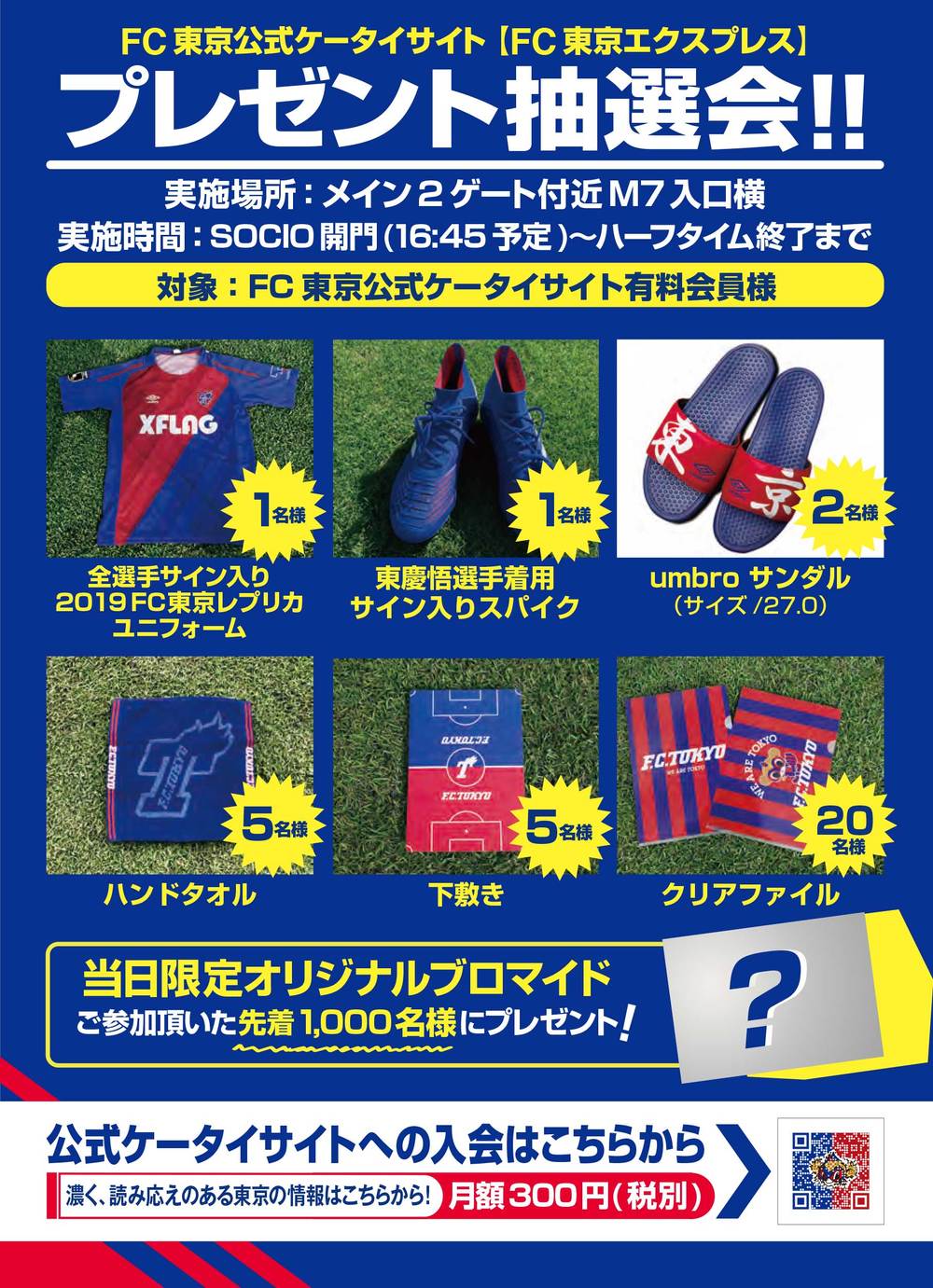抽奖券可于7/7(周日)比赛当天12:00起在官方手机网站“FC东京快线”发放。发放抽奖券后,将显示抽奖号码,请向主场2号门附近M7入口旁的官方手机网站展位工作人员出示。