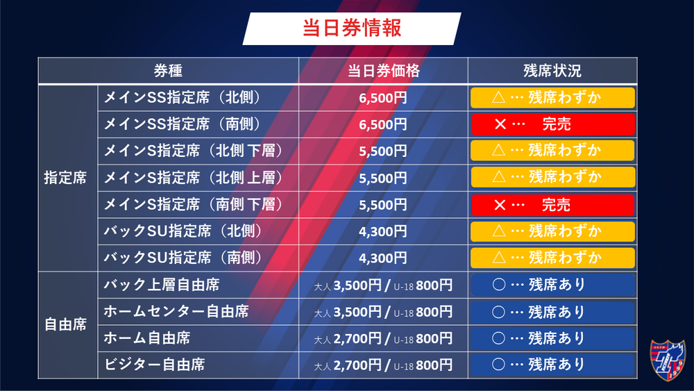 7/7(周日)2019明治安田生命J1联赛第18轮对阵Gamba大阪比赛(19:00开球/味之素体育馆)当天门票销售通知如下。