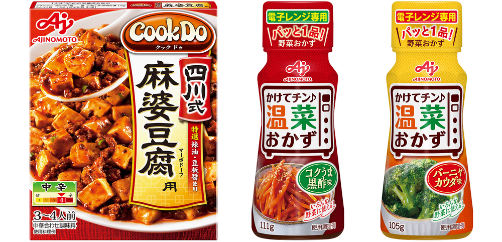・“CookDo®四川风味麻婆豆腐”“微波加热温菜配料巴尼亚考达味”“微波加热温菜配料浓郁美味黑醋味”各一个