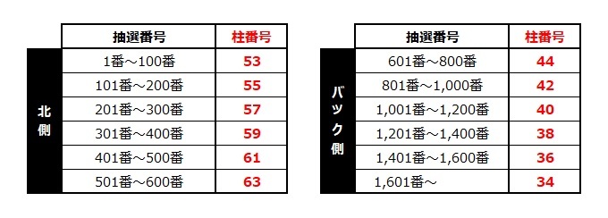 ・看台内设有按抽签号码顺序排列的座位区域(参照柱号)。请确认您的抽签号码后,在相应区域内等待。※原则上每100号为一个区块。