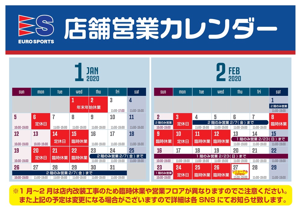 Euro Sports味之素体育馆店『因店内装修工程的营业日变更通知』 2020/1/10 商品 FC东京官方商店“Euro Sports味之素体育馆店”将进行店内装修工程。营业日期将因此变更,现将变更内容通知如下。 请确认无误,感谢您的配合。 【营业日历】 □店铺营业由于装修将分为店内的一楼和二楼进行,施工期间营业日将限定楼层营业。出入口根据日期不同,请注意。 □在线营业特别是没有变化,照常营业,但由于施工原因,发货作业可能需要较长时间。 请事先谅解。