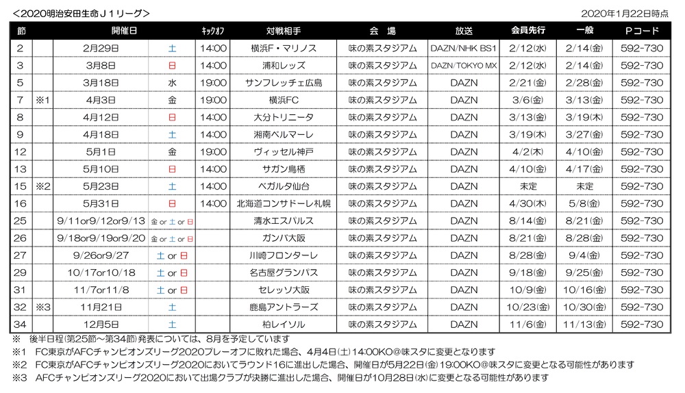 关于2020赛季FC东京主场比赛日程,现已确定如下,特此通知。