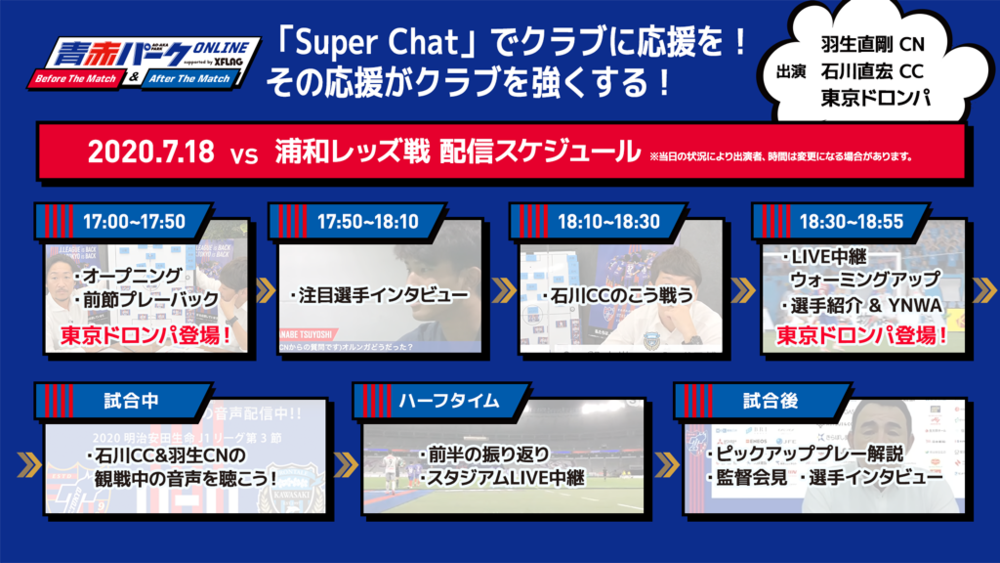 在FC东京,作为STAY WITH TOKYO措施的一部分,我们将在J1联赛比赛前后,于YouTube【FC东京官方频道】举办直播企划『AO-AKA PARK在线赛前/赛后,由XFLAG支持』。
