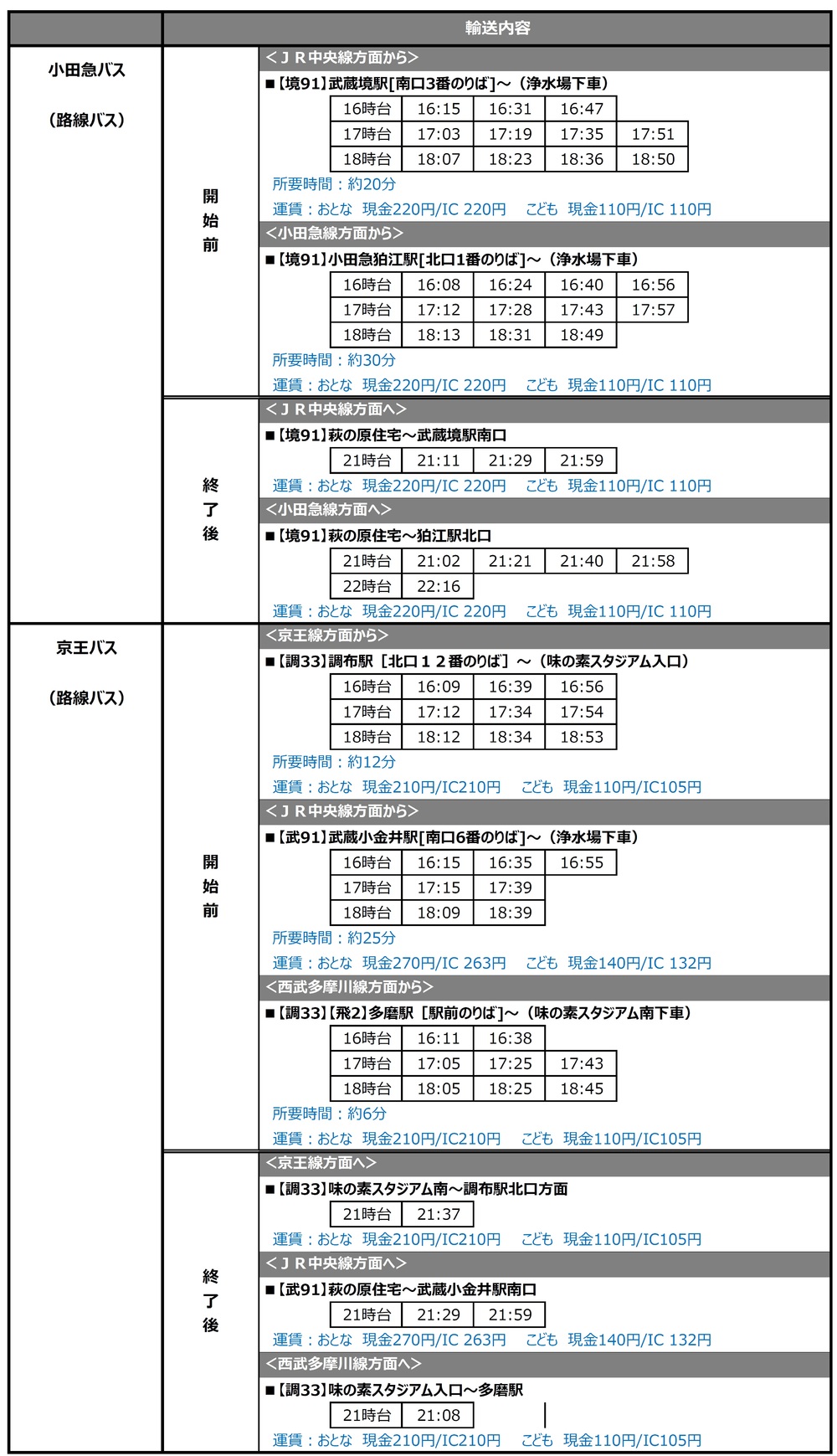 8/1(周六)2020明治安田生命J1联赛 第8轮 vs Sagan鸟栖(19:00开球/味之素体育馆)的班车和路线公交的运营信息。