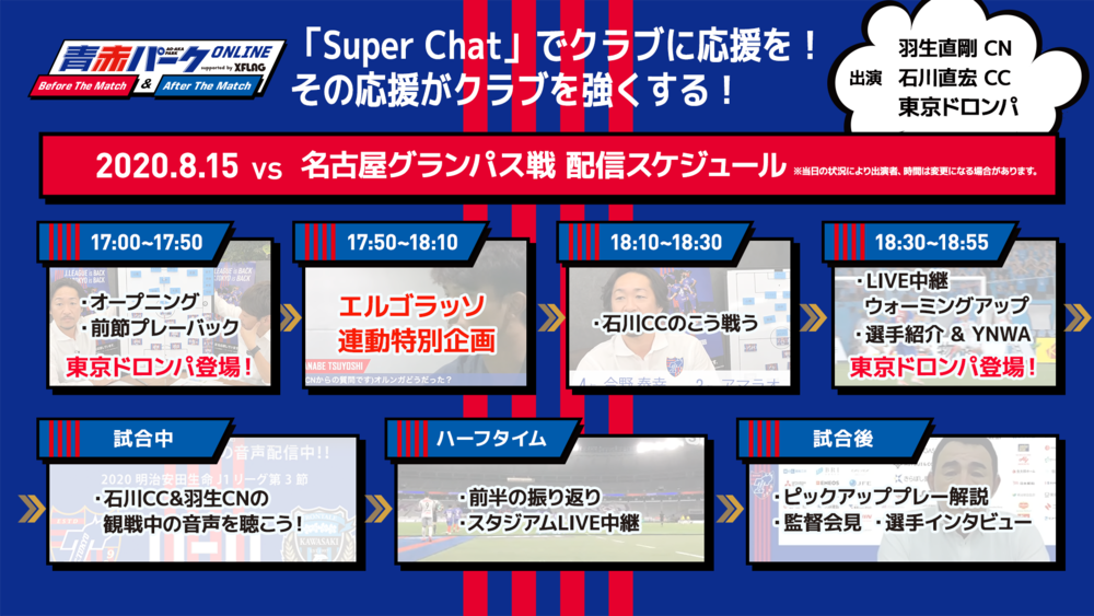 在FC东京,作为STAY WITH TOKYO措施的一部分,我们将在J1联赛比赛前后,于YouTube【FC东京官方频道】举办直播企划『AO-AKA PARK在线赛前/赛后,由XFLAG支持』。