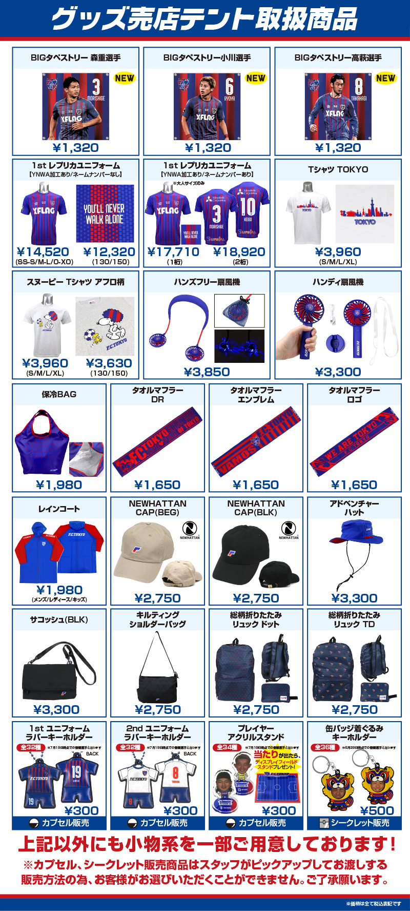 8月23日(周日)2020明治安田生命J1联赛 第12轮 vs湘南Bellmare(19:00开球/味之素体育馆)将设有商品售卖处和扭蛋区。