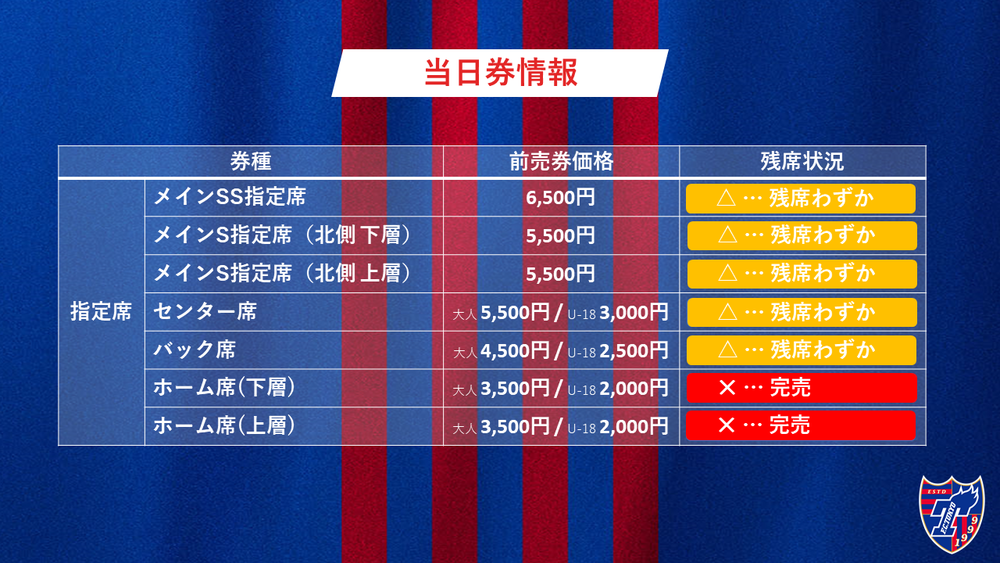 此外,现场不销售当日票。仅通过FC东京(J联赛票务)销售。