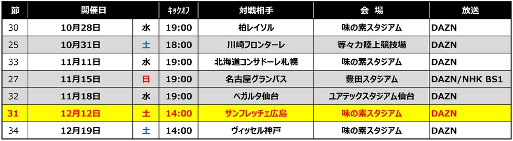 明治安田生命J1联赛第31轮 广岛战 举办日期及开球时间确定通知 2020/10/26 俱乐部通知 关于尚未确定的明治安田生命J1联赛第31轮对阵广岛的比赛,现已决定比赛日期和开球时间,具体如下,特此通知。 □比赛2020明治安田生命J1联赛 第31轮FC东京 vs Sanfrecce广岛 □举办日期和时间12月12日(周六) 14:00开球 □会场味之素体育馆 ▽今后的日程 ◇关于AFC冠军联赛2020的举办日程,请点击这里</a>