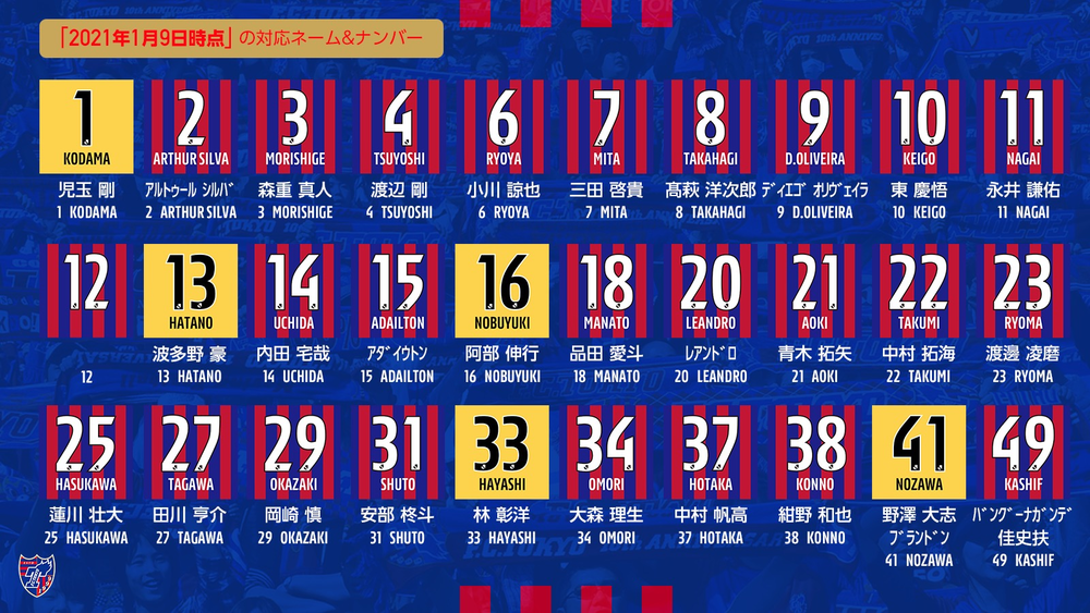 从2021赛季起,将采用J联赛统一的姓名和号码