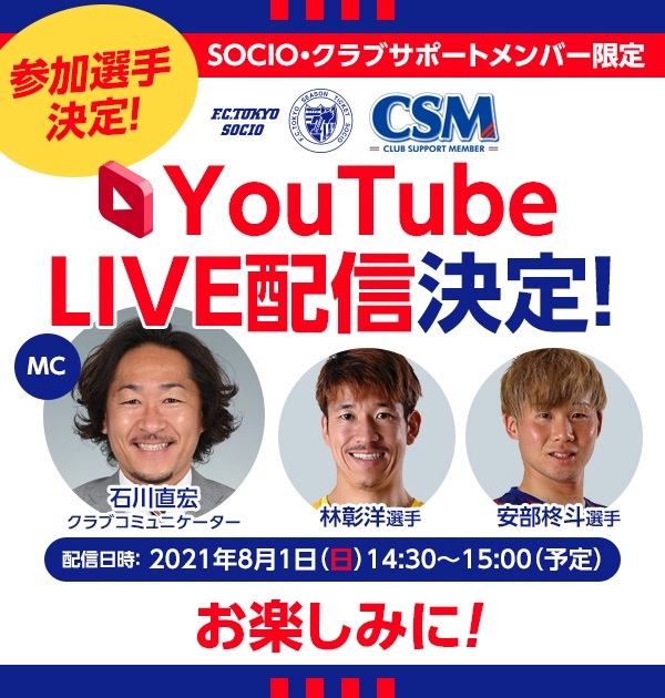在味之素体育馆的主场比赛将近两个月未举行之际,为了向平时给予俱乐部热情支持的各位传达选手石川CC的真实声音,并希望大家能更贴近FC东京,我们将在以下日期为SOCIO及俱乐部支持会员限定进行YouTube直播。请务必把握此次机会参加。
