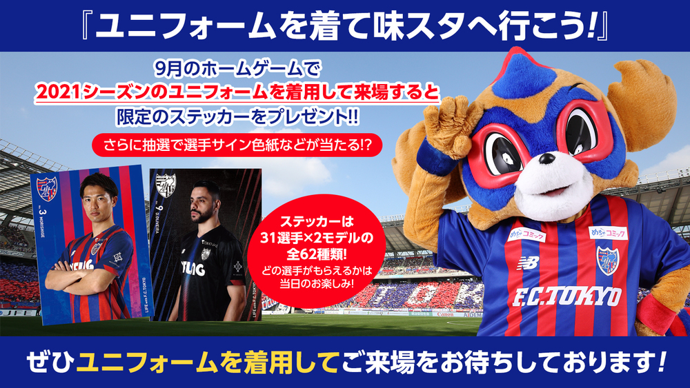 时隔77天再次迎来在味之素体育馆的主场比赛,9月12日(周日)对阵柏太Reysol开始的主场4连战中,作为“TOKYO IS COMING BACK”的一部分,“穿上球衣去味之素体育场!”将举办2021球衣穿着者限定活动。穿上New Balance的FC东京球衣,与站在球场上的球员们一起战斗吧!