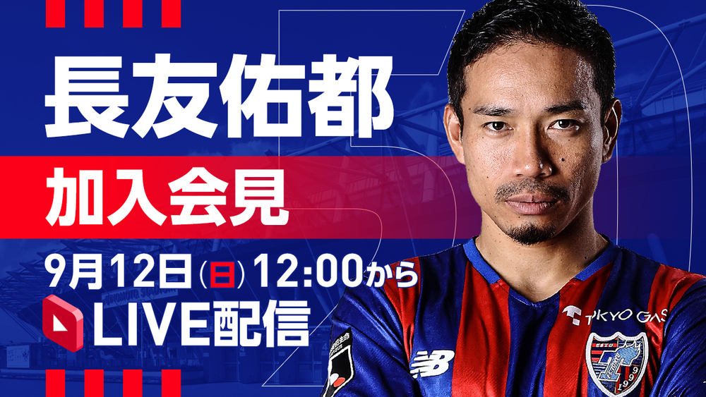 【紧急发布!】长友佑都选手 加入发布会直播通知 2021/9/12 一线队 现通知您,长友佑都选手完全转会加盟的加盟发布会现场,将在FC东京官方Youtube频道进行直播。请务必观看! □配信日期和时间2021年9月12日(周日) 12:00~12:30(预计) □出席者长友佑都选手 □配信详情YouTube FC东京官方频道 fctokyochannel将进行直播。◇直播请点击这里!