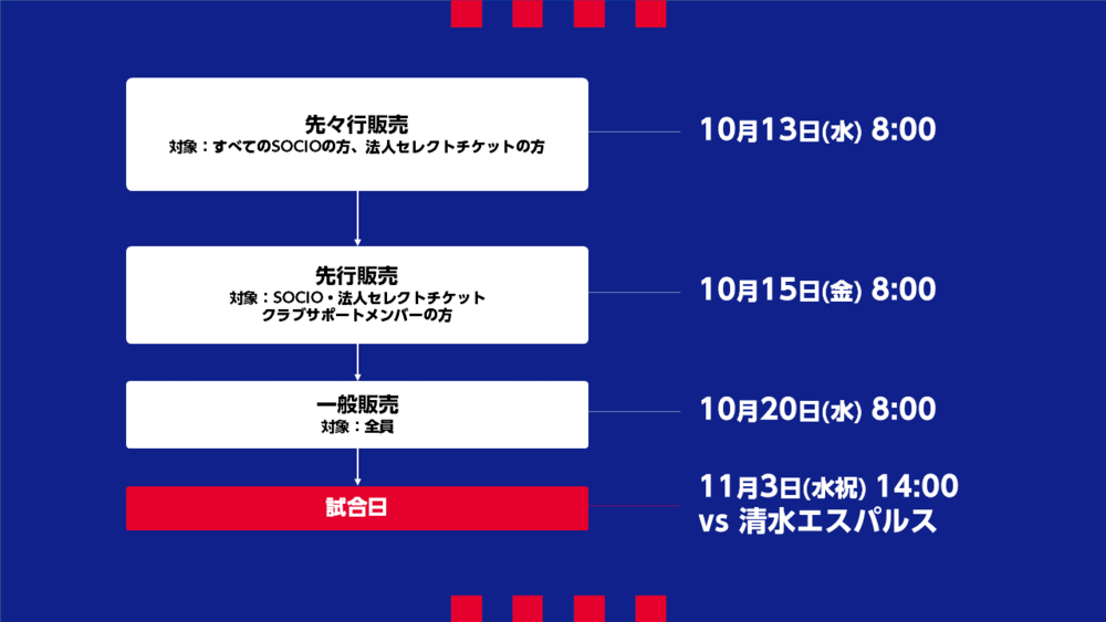 ・购买期间:10月15日(周五) 8:00~比赛当天半场结束前・优惠价格:800日元/1张(正常价格成人4,300日元,U-18 1,300日元)