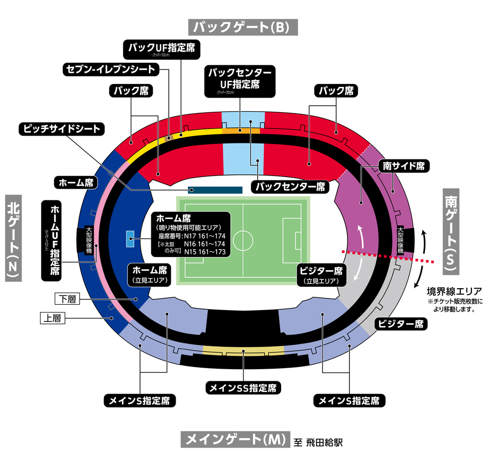 ※主看台SS指定席南侧、主看台S指定席南侧为混合区域。