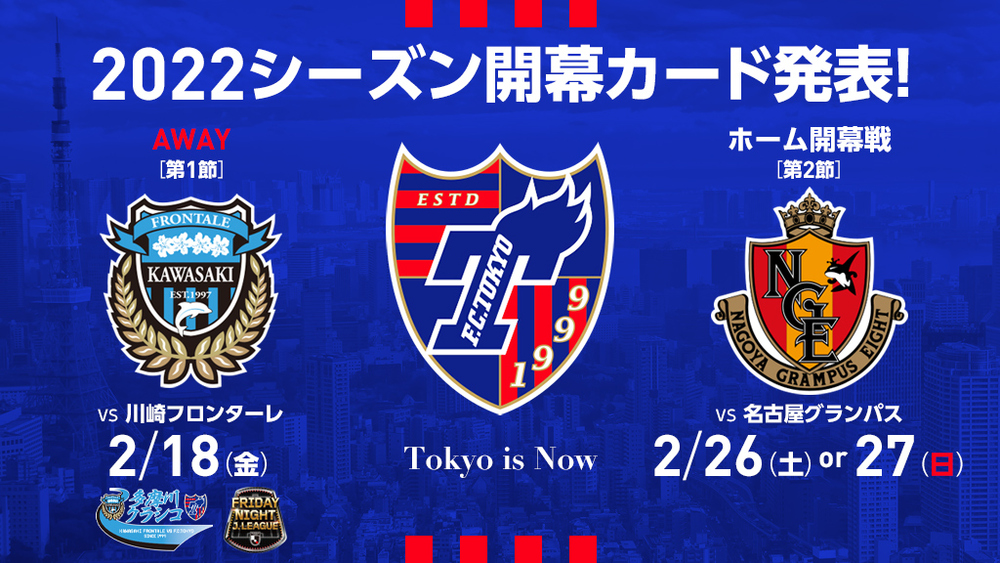 2022明治安田生命J1联赛开幕对阵确定! 2021/12/24 俱乐部通知 2022明治安田生命J1联赛第1轮、第2轮的对阵卡已确定,特此通知。 此外,场馆和开球时间等详细信息将在确定后于比赛日程栏中通知。 【第1节】・对阵卡片:川崎Frontale vs FC东京・举办日:2月18日(周五) 【第2轮】 ※主场揭幕战・对阵卡片:FC东京 vs 名古屋Grampus・举办日期:2月26日(周六)或27日(周日)