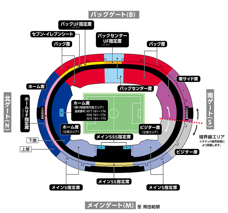 ※主看台SS指定席南侧、主看台S指定席南侧为混合区域。