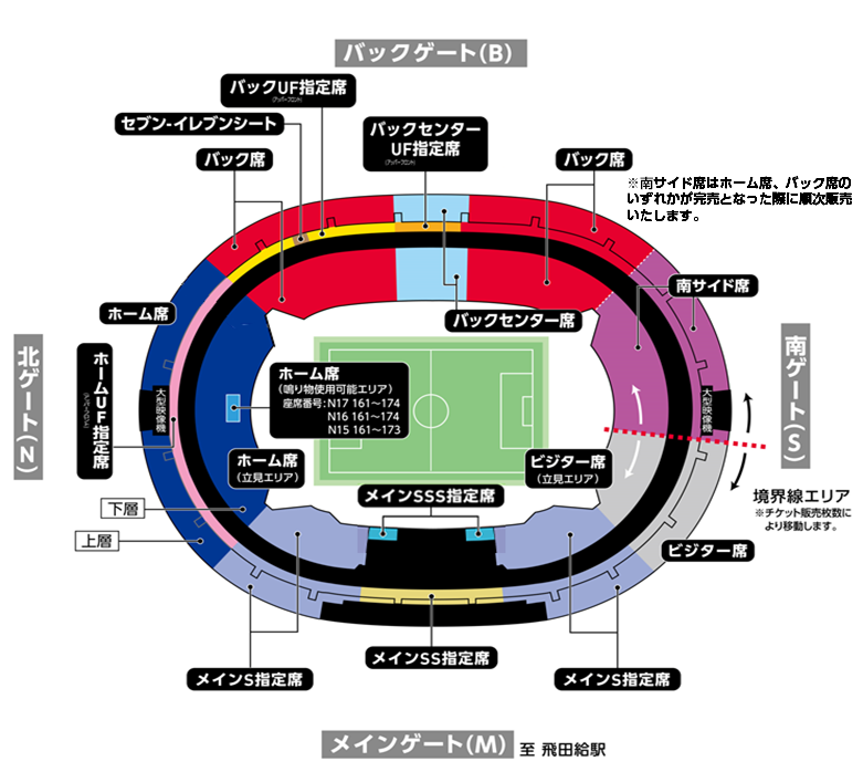 ※主看台SS指定席南侧、主看台S指定席南侧为混合区域。