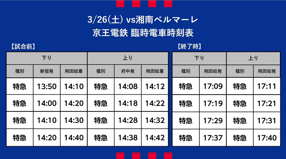 3月26日(周六) 2022 J联赛YBC鲁万杯 第3轮 vs 湘南Bellmare(15:00开球/味之素体育馆)期间运营的临时交通接驳(铁路)、穿梭巴士及线路巴士相关信息。