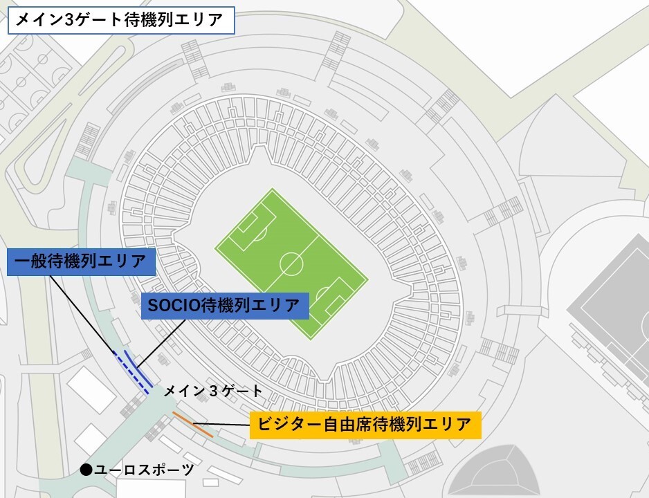 ※SOCIO开门后的一定时间内,每个入口限制可入场的席位种类。此外,开门初期因限制通道内通行,北侧看台⇔后看台之间无法通行。请提前入场的观众确认自己的席位种类及可入场的入口后,在排队区域排队等待入场。</span>