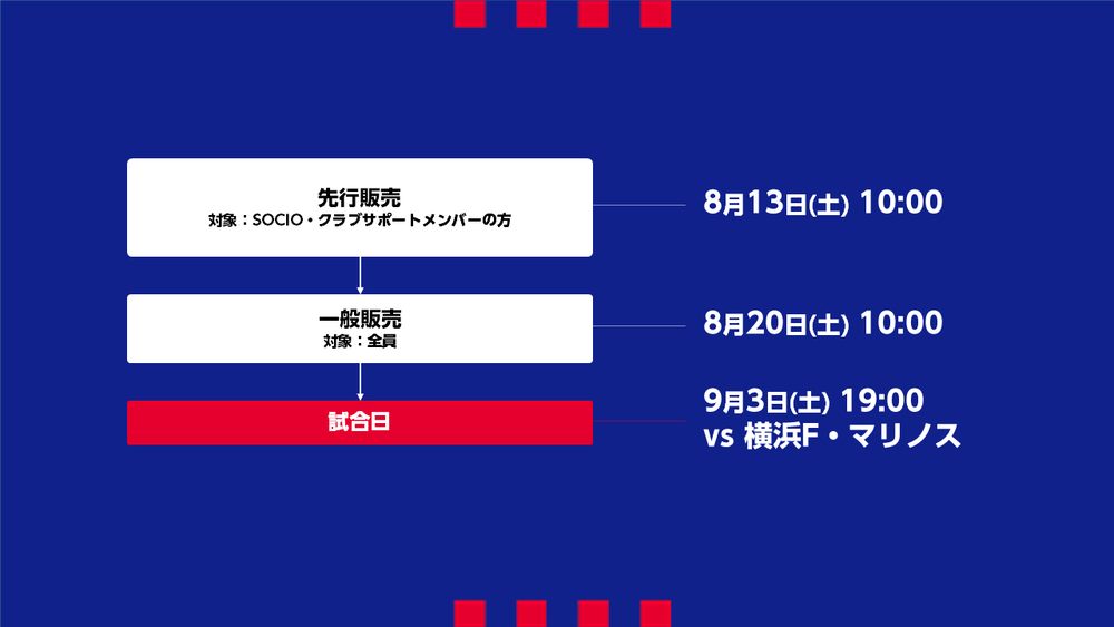 门票销售开始~9月3日(周六)开球前※通过转让SOCIO门票获得的观众,无法优先入场