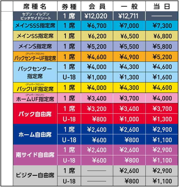 ※访客队的球衣、商品的穿着,以及支持访客队的座位种类为上述的“主看台SS指定席 南侧”、“主看台S指定席 南侧”、“访客自由席”这三种座位,除此之外的所有座位均为FC东京的支持席。