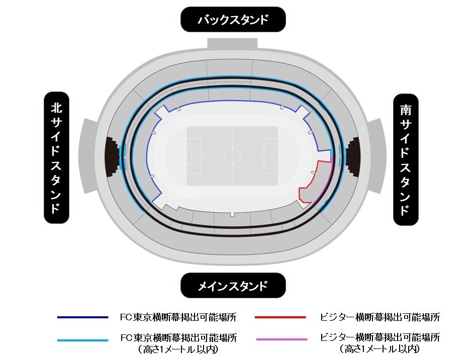 穿着客队队服及商品的人员禁止进入北侧看台(第1至第3层)。另外,穿着FC东京队服及商品的人员禁止进入南侧看台(客队席区域),请注意。