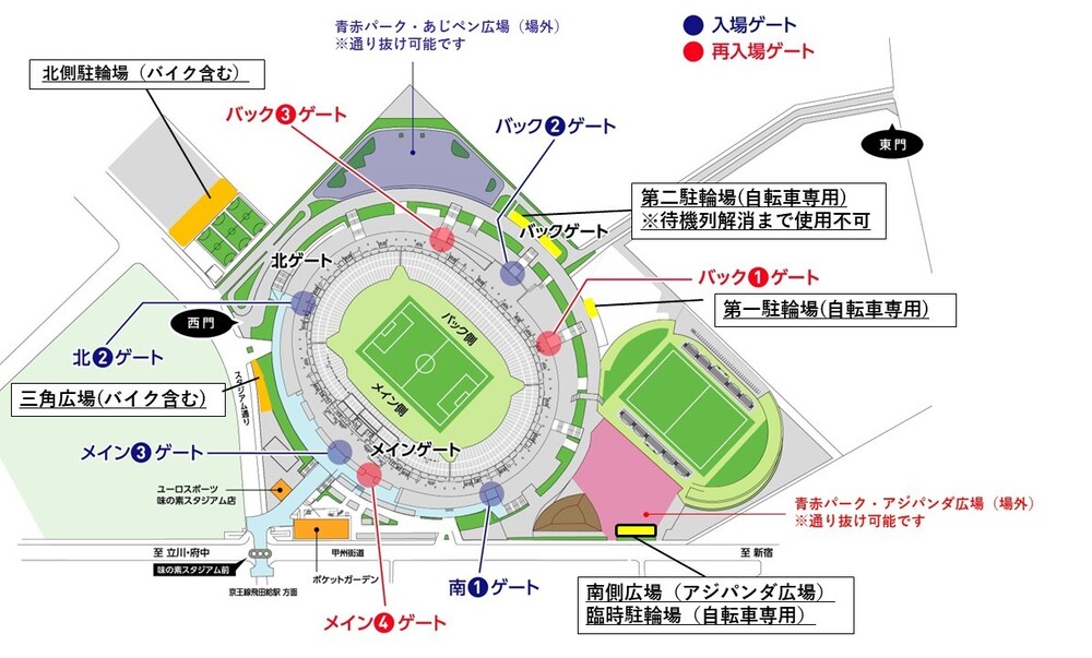 【来自味之素体育馆的通知】8/7(周日) 关于清水战自行车及摩托车停车场 2022/8/3 比赛信息 关于8月7日(周日)清水S-Pulse比赛的自行车及摩托车停车场的通知。 ◇访问信息请点击这里 □目标比赛8月7(周日) vs 清水S-Pulse(18:00开球/味之素体育馆) □可使用区域(见下文)・北侧自行车停车场(含摩托车)・第一停车场(自行车专用)・第二停车场(仅限自行车)※等待队列解除前无法使用。・南侧广场临时自行车停车场(仅限自行车)・三角广场(包括摩托车)