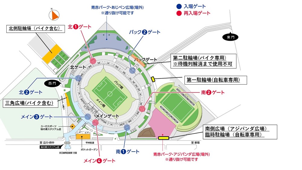 【来自味之素体育馆的通知】9/3(周六) 关于横滨FM战的自行车及摩托车停车场 2022/8/31 比赛信息 关于9月3日(周六)横滨FMarinos比赛的自行车及摩托车停车场的通知。 ◇访问信息请点击这里 □目标比赛9月3日(周六) vs 横滨FMarinos(19:00开球/味之素体育馆) □可使用区域(见下文)・北侧自行车停车场(含摩托车)・第一停车场(自行车专用)・第二停车场(仅限摩托车)※等待队列解除前无法使用。・南侧广场临时自行车停车场(仅限自行车)・三角广场(包括摩托车)