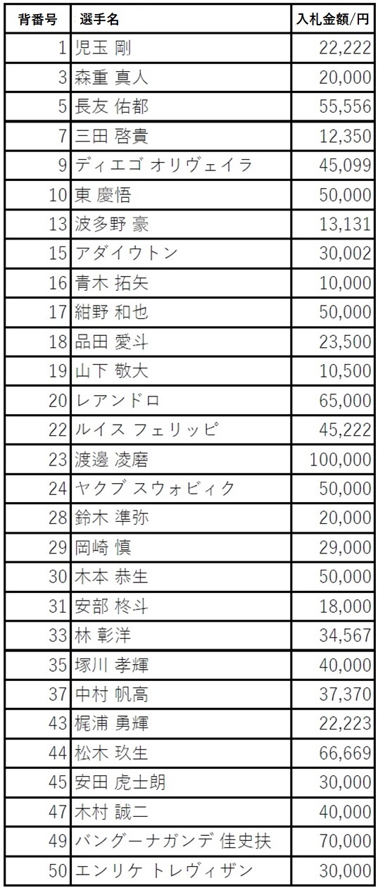 11月5日(周六)12:00开始进行的“Big Thank You Day~本赛季也感谢东京!~”第一套球衣拍卖的中期结果通知。