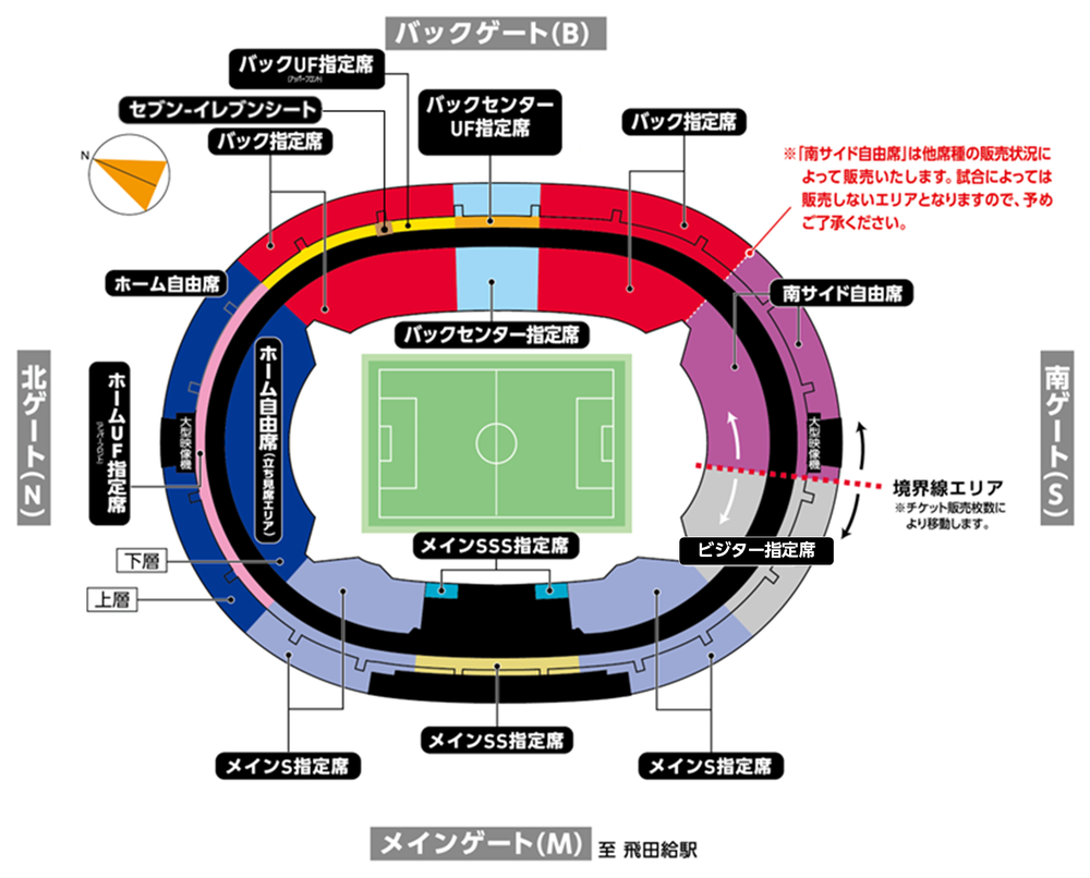 ※访客队的制服、商品的穿着,以及支持访客队的座位种类为上述的“主看台SS指定席 南侧”、“主看台S指定席 南侧”、“访客指定席”这三种座位,除此之外的所有座位均为FC东京的支持席。