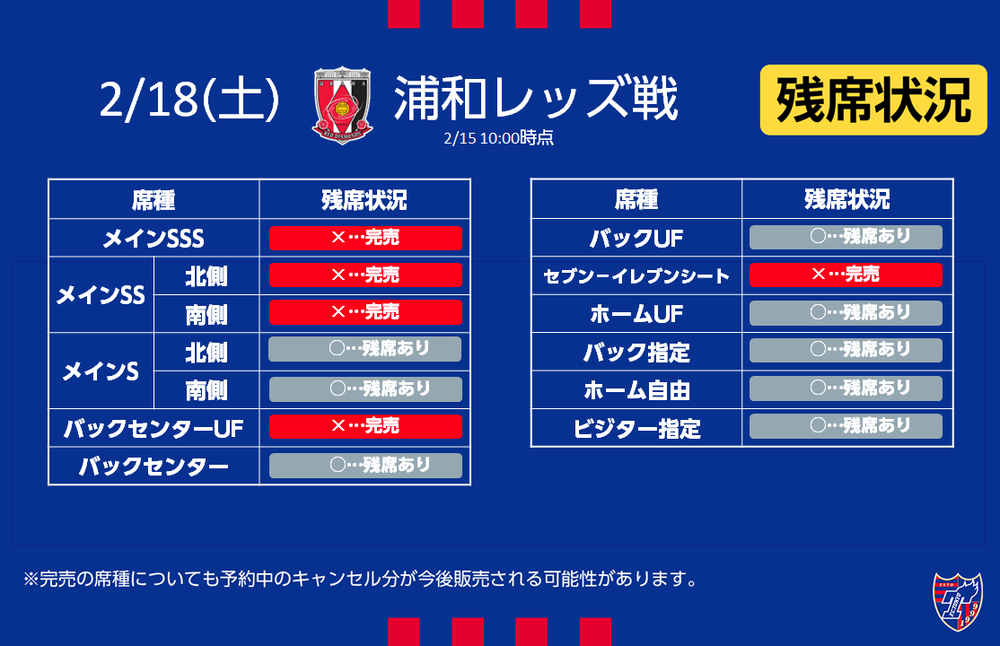 2月18日(周六)2023明治安田生命J1联赛第1轮 vs浦和Reds比赛(14:00开球/味之素体育馆)的预售票销售情况,现通知如下。