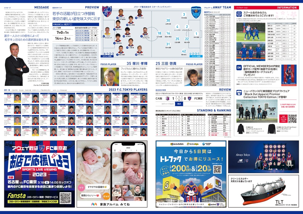 3/12(周日) 横滨FC战 官方比赛日程程序说明 2023/3/11 比赛信息 3月12日(周日) 2023明治安田生命J1联赛 第4轮 vs横滨FC(15:00开球/味之素体育馆)的官方比赛日程节目,现通知如下。 □官方比赛日程2023</span></strong>【采访】东庆悟 选手・页数:B4尺寸(对折)4页※可从页面底部的PDF查看。 ◇比赛信息请点击这里</strong> ▽PDF查看请点击这里 2023官方比赛日程程序(0312#4横滨FC).pdf