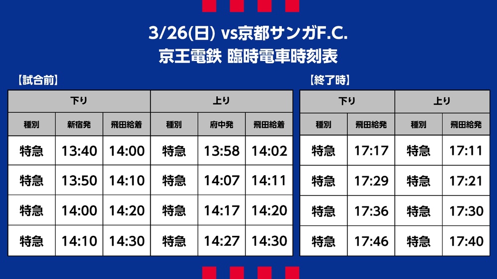 2023年3月26日(周日) J联赛YBC鲁万杯 小组赛 第2轮 对阵 京都SANGA F.C.(15:00开球/味之素体育馆)期间运营的临时交通接驳(铁路)、穿梭巴士及线路巴士相关信息。