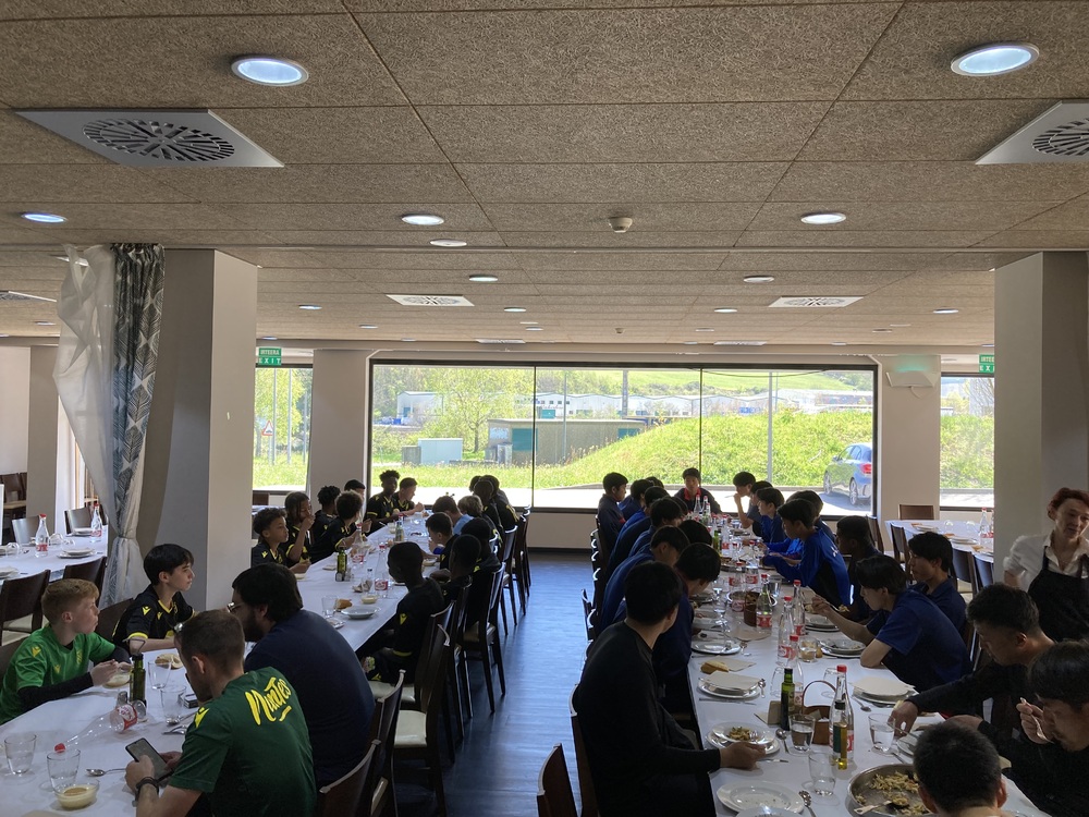 从今天开始举办的大赛地点位于宿舍乘公交约10分钟的地方,是位于圣塞巴斯蒂安郊区的皇家社会顶级球队及青训学院的训练设施“Zubieta”。位于山腰的Zubieta拥有6个球场(未来还计划增加2个),并配有咖啡厅和观赛看台。同样的U-13同级别比赛也在该设施举办,现场有音乐和场内主持,充满了节日气氛。