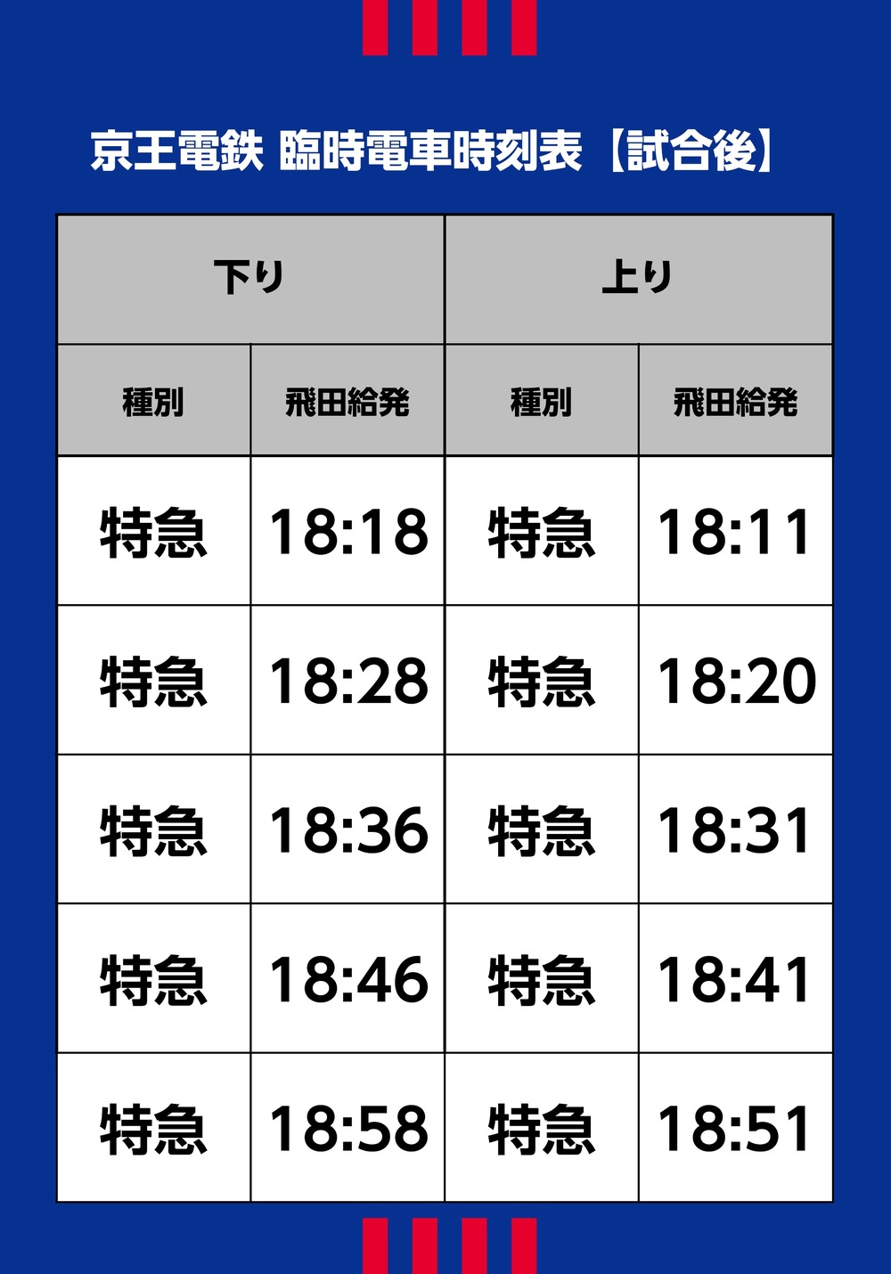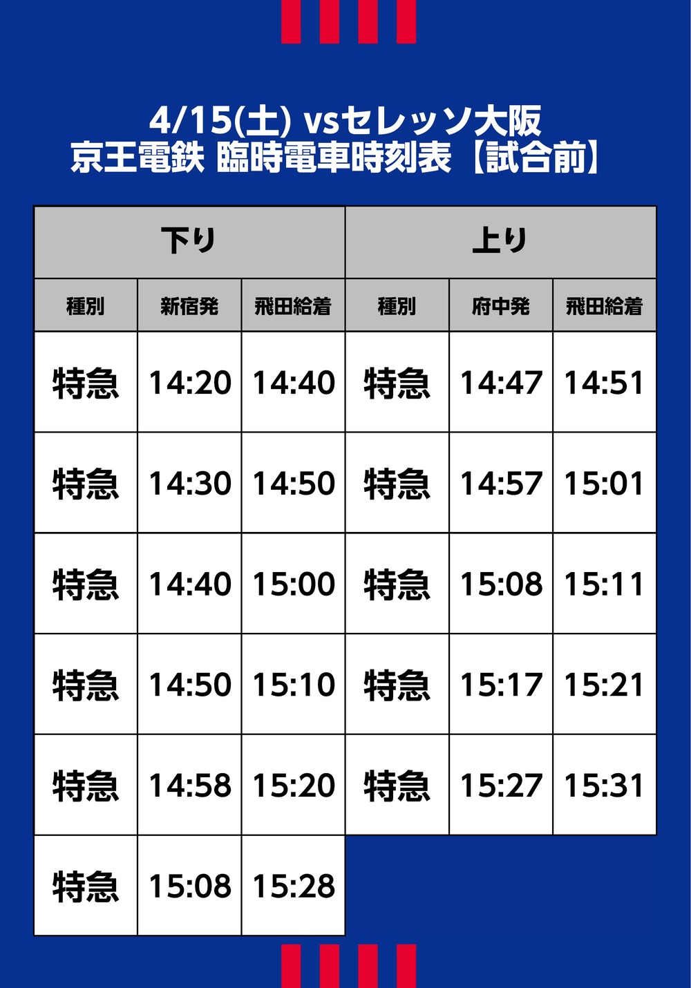 4月15日(周六) 2023明治安田生命J1联赛 第8轮 vs Cerezo大阪(16:00开球/味之素体育馆)期间运营的临时交通接驳(铁路)、穿梭巴士及线路巴士的相关信息。