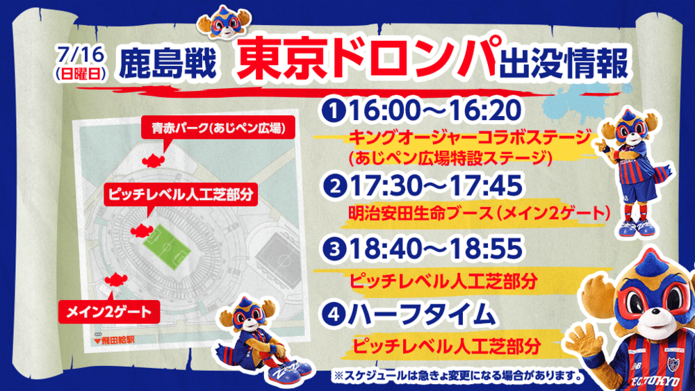 7月16日(周日) 2023明治安田生命J1联赛 第21轮 vs 鹿岛Antlers (19:00开球/味之素体育馆) TOKYO DOROMPA将如以下所示出现。