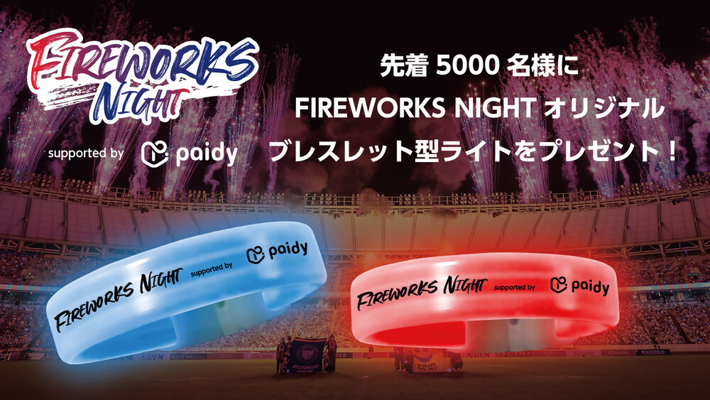 2023年7月16日(周日) 明治安田生命J1联赛 第21轮 vs 鹿岛Antlers (19:00开球/味之素体育馆)为纪念举办『FIREWORKS NIGHT supported by Paidy』,将向先到的5,000名观众赠送手环型灯。