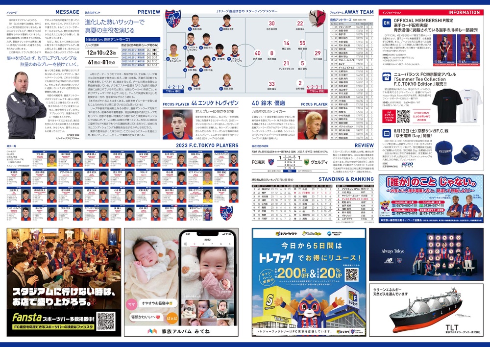 7/16(周日) 鹿岛战 官方比赛日程 2023/7/15 比赛信息 7月16日(周日) 2023明治安田生命J1联赛 第21轮 vs鹿岛Antlers(19:00开球/味之素体育馆)的官方比赛日程程序,现通知如下。 □官方比赛日程2023</span></strong>【采访】松木玖生 球员・页数:B4尺寸(对折)4页※可从页面底部的PDF查看。 ◇比赛信息请点击这里</strong> ▽PDF查看请点击这里 2023官方比赛日程程序(0716#21鹿岛Antlers).pdf